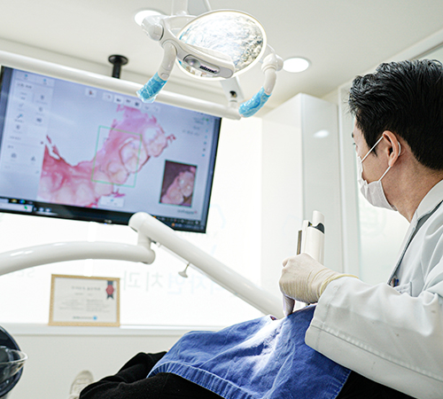 To accurately assess the condition of teeth, a 3D digital intraoral scanner is used to capture precise dental data. Integrated with our digital prosthetic fabrication system, this enables faster and more accurate treatment outcomes.