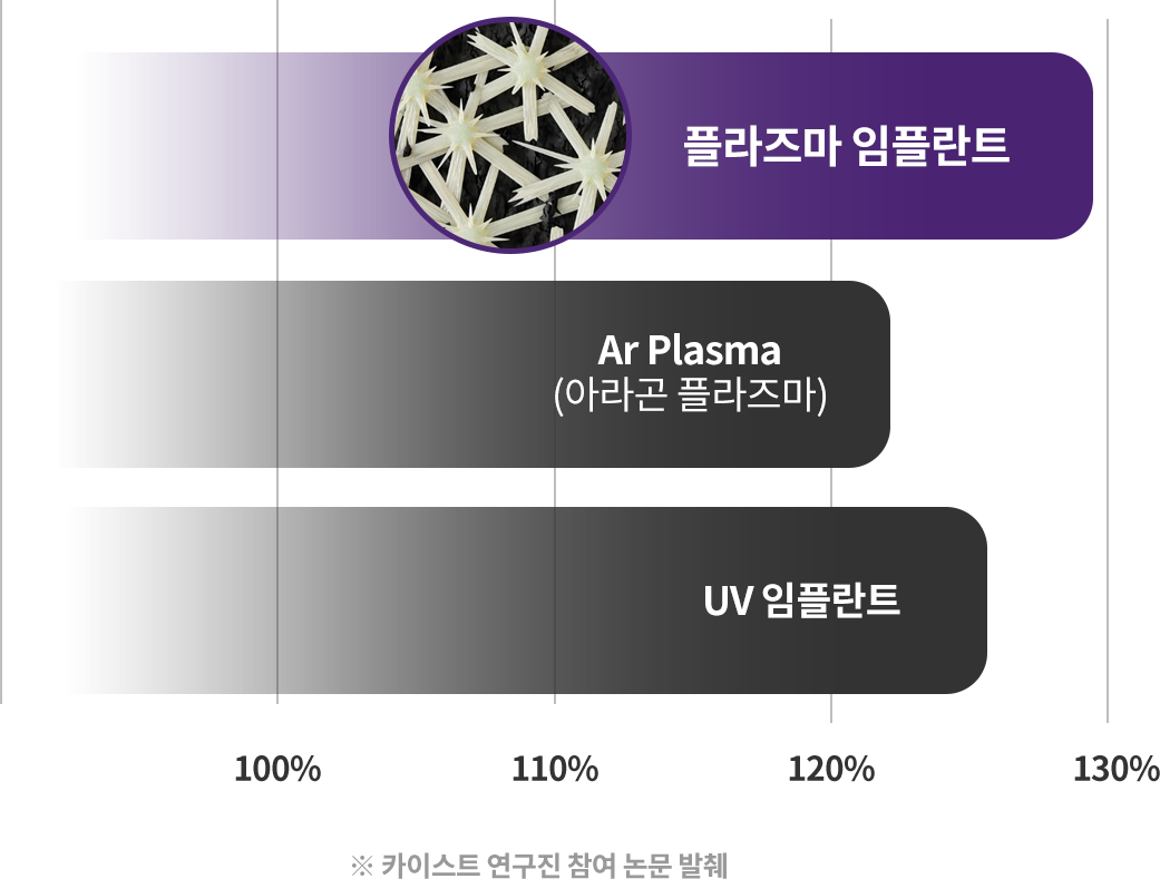 미국 하버드대 치과대학 연구진의 실험 결과, 플라즈마 임플란트는 골유착률이 우수하고, 뼈 손실을 줄이며, 치유 기간을 단축하고 장기 안정성을 향상시키는 것으로 나타났습니다.